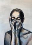 Девушка на портрете. Прямой и строгий взгляд. Голубые оттенки краски. Объёмные мазки.