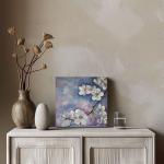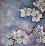 Масляная картина крупным планом с изображением белых вишен на ветке на нежном фиолетовом и бледно-голубом фоне. В работе использованы импрессионистские приемы с густыми мазками, захватывающими изящные лепестки и элегантные детали цветов, создающими ощущение спокойствия и красоты.