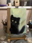 Авторская работа , единственный экземпляр. Черный , пушистый котик, просящий хозяина не уходить. Холст на подрамнике / масло . Размер 24см на 18см