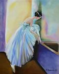 Картина маслом "Балерина" выполнена кистью и мастихином на холсте с подрамником в 2020 году. Размер её 50 на 40 см. На холсте изображена молодая девушка балерина перед началом представления.