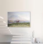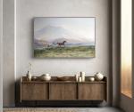 На заднем плане возвышается Эльбрус, его снежные вершины сверкают под солнечными лучами, создавая величественный фон для этой динамичной сцены. Небо ясное и голубое, а легкий ветер придает движению лошадей дополнительную динамику. Картина передает ощущение свободы и силы природы, а также гармонию между животными и окружающим миром.