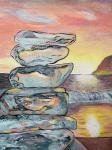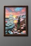Эта картина переносит зрителя на живописный берег Тихого океана, где теплые лучи заходящего солнца окрашивают ледяные глыбы в нежные розово-фиолетовые оттенки. Загадочная фигура в зимней одежде наблюдает за стихией, вдыхая холодный воздух океана. Пирамида из льдин кажется почти нереальной – сложена ли она людьми или создана самой природой? Картина передает атмосферу умиротворения, загадочности и единения с природой.
