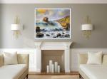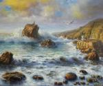 Классический морской пейзаж. Большие, неровные, возвышающиеся над волнами и частично погруженные в воду скалы, уходящая вдаль скалистая береговая линия дают ощущение мощи земли. Теплое золотистое освещение заката не только подчеркивает текстуру скал, но и создает безмятежное и яркое настроение серо-синему небу с рассеянными облаками. Картина вечерней безмятежности, которую нарушает лишь прибой, с огромной силой разбивающийся о прибрежные скалы и созданный природой волнорез. Чайки с восторгом встречают закат и игру волн. Общая композиция передает ощущение природной красоты и мощи океана, движения и энергии морской стихии.