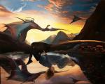 Летающие разумные драконы на планете Таннис. Девочка катается на разумном драконе, и свисает с него чтобы посмотреть на водную гладь.