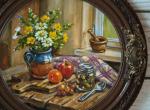 Ключевые слова: ступка, полевые цветы, яблоко, персик, ложка, фрукты, деревня, кухонный натюрморт