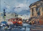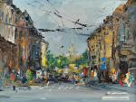 Выразительный городской этюд из серии «Питерские этюды», выполненный в технике масляной живописи мастихином. Работа передаёт живую атмосферу старого Петербурга: солнечный свет скользит по фасадам домов, на фоне ярко выделяются купола церкви, улица наполнена движением и цветом.