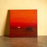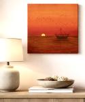 Тёплый шафранный закат окутывает море мягким светом, а лодка в дрейфе создаёт ощущение тишины и уюта. Картина наполняет пространство спокойствием и глубиной, становясь акцентом в современном интерьере.