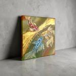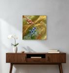 На картине изображены три грациозных карпа кои — красный, золотой и синий с белыми пятнами — встречаются носами у изогнутого золотого моста на фоне пузырящейся зелёно-оранжевой воды. Абстрактный стиль с текстурными мазками создаёт ощущение гармонии и движения, символизируя удачу и единство в восточной философии. Размер 3030 см идеален для уютного интерьера.