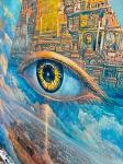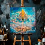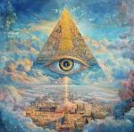 В этой картине раскрывается акт божественного творения, момент зарождения мироздания. Золотая пирамида, словно древний символ мудрости и вечности, устремляется ввысь, соединяя небеса и землю. В ее центре — всевидящее око, источник света, знания и энергии, направляющий поток творческой силы в саму суть мироздания.