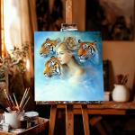Эта работа — как продолжение диалога, начатого в первой картине. Если в «Тиграх её духа» звучала напряжённость и предостережение, то здесь — внутренняя гармония, поддержка и безмолвная сила, стоящая рядом. На фоне эфемерной лазури, где небо сливается с морем, женщина окружена четырьмя тиграми, словно духами-хранителями. Они не позади и не впереди — они с ней, как проявления её характера: мужественные, чуткие, молчаливые, но в любой момент готовые защищать. Это картина не угрозы, а достоинства. Женственность в ней не противоположность силе, а её источник. Это образ женщины, в которой хрупкость — форма стойкости, а нежность — путь к выживанию и победе.