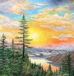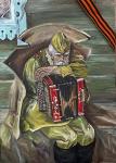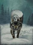Волк, несущий на себе ягненка. Картина выполнена в холодных тонах (синий, серый), что создает ощущение тревоги и опасности. На заднем плане виден зимний лес.