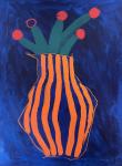 Абстрактная картина в стиле Матисса с оранжево-синей полосатой вазой и цветами, с жирными линиями, простыми формами, плоскими цветами и темно-синим фоном. Игривый, детский стиль с минималистичной эстетикой.