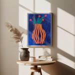 Добавьте игривый и яркий акцент в ваш интерьер с этой картиной в стиле Матисса, изображающей оранжево-синюю полосатую вазу с цветами. Вдохновлённая техникой вырезок и выразительными формами Анри Матисса, эта работа сочетает смелые линии, простые формы и тёмно-синий фон, что создает оригинальную и современную композицию.