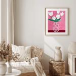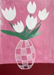 Идеальный выбор для ценителей современного флористического искусства, эта работа воплощает красоту простоты и одновременно очаровывает яркими цветами и геометрическими узорами. Нежные белые тюльпаны элегантно контрастируют с выразительной клетчатой вазой, делая картину ярким акцентом в любом пространстве.
