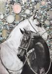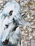 Картина с изображением прекрасной лошади и мозаичным фоном из полудрагоценных камней. Художественный стиль объединяет реализм с абстракцией, создавая уникальный визуальный эффект.