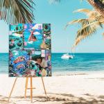 Картина оживает благодаря объемным акриловым элементам: пальмовые листья добавляют текстуры, а полупрозрачные перламутровые детали, переливающиеся на солнце, создают магический эффект. Позитивные фразы "GOOD VIBES" и "SUNNY DAYS AHEAD", а также сияющие надписи "PARADISE" и "OCEAN DREAMS" добавляют настроения и особого летнего вайба.