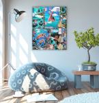 Эта оригинальная авторская микс медиа картина на холсте - настоящий портал в мир безмятежности и солнечного тепла. Она представляет собой завораживающий коллаж, где каждый элемент тщательно подобран, чтобы передать атмосферу тропического рая. Разделенные изящными полосами, украшенными полудрагоценными камнями (амазонит, нефрит, сердолик, оникс, галиотис, говлит и бирюза), а также морским стеклом и мерцающими стразами, изображения сливаются в единую гармоничную композицию.