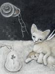 Крылатая кошка мягко обнимает спящую девочку, словно охраняет её сны. На столе под стеклянным куполом стоит трёхлистный клевер с надписью “I’m near” — напоминание о присутствии, которое не требует слов. Над ними светит лампа в форме раковины, из которой спускается тонкая лестница — путь между мирами сна и яви.