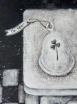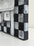 Внизу столика видна замочная скважина — символ тайны и внутреннего пространства души. Шахматный узор на фоне создаёт ощущение глубины и хрупкого равновесия между светом и тенью.