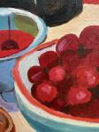 Это натюрморт- гимн зрелости, вкусу и летнему изобилию. Сочный разрезанный арбуз становится центром композиции, притягивая взгляд своей насыщенной красной плотью. Вишневое варенье, лимоны и миска с темной спелой вишней создают игру контрастов/ сладкого и кислого, света и глубины цвета.