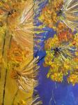 Желтые простые цветы в вазе добавляют композиции легкость и наивную радость, а желто- сиреневая стена на фоне усиливает декоративность и современное звучание работы. Красная скатерть прочеркивает энергию картины, наполняя её теплом, страстью и жизненной силой.