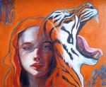 Огненная дуальность — Девушка и рычащий тигр, масло на оргалите 40×50 см