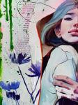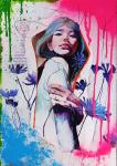 Работа — манифест хрупкости самоидентификации. Реалистичный, почти эфемерный образ девушки буквально «прорастает» сквозь газетные страницы и агрессивные неоновые подтеки. Смешанная техника подчеркивает фрагментарность: нежные васильки контрастируют с хаотичным цветом, символизируя попытку сохранить чистоту внутреннего «Я» в шумном, давящем информационном поле. Это визуальная летопись поиска собственной целостности среди обломков смыслов и чужих историй.