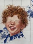 Ключевые слова: Мальчик, портрет ребенка, пастель, рыжие волосы, детская радость, реализм, голубой орнамент, эмоции, смех, интерьерное искусство, современная живопись, портрет пастелью