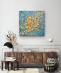 Сине-бирюзовый фон — то ли небо, то ли вода — добавляет лёгкости и глубины. Контраст между ним и тёплыми шарами создаёт мягкую вибрацию, приятную для глаза и гармоничную для восприятия.