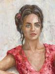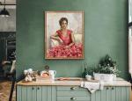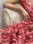 Платье женщины словно соткано из лепестков розы: энергичные, пастозные мазки мастихина создают ощущение движения и плотности формы, в то время как отдельные участки прописаны тонко и филигранно. Такое сочетание делает поверхность живой, дышащей, наполненной внутренним ритмом. Цветовая палитра строится на розово-пудровых, тёплых телесных и мягких золотистых оттенках, создавая ощущение гармонии и защищённости.