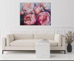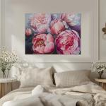 Эта большая акриловая картина (60 x 80 см) изображает крупным планом пионы в полном цвету, их многослойные лепестки переполнены жизнью и цветом. Каждый цветок словно дышит — нежные розовые, румяные и кораллово-красные оттенки гармонично сочетаются с тонкими акцентами лавандового, бледно-голубого и кремово-белого.