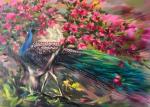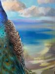 Меня увлекла работа с цветом. Представить, как холодный отблеск сапфирового оперения павлина будет встречаться с теплым золотом древнего мрамора… А как его изумрудные и золотые «очи» будут перекликаться с оттенками лаванды и роз .Мне захотелось передать настроение, не кричащее, а глубокое, меланхоличное и умиротворенное. Мне безумно нравится, что этот павлин — не просто яркий объект, а философ, созерцатель. В его позе, в его взгляде, устремленном в морскую даль, целая история. Зрителю придется остановиться и задуматься, о чем же он грезит. Это не просто красивая картинка, это диалог с вечностью!