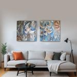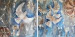 Ключевые слова: Диптих, голуби, весна, полёт, обновление, синий цвет, золотой свет, абстракция, радость, пробуждение, фактурная картина