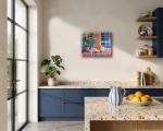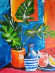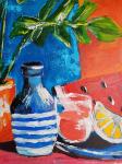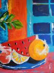 Яркая ода тёплым дням. На столе — сочный арбузный ломтик, яркие фрукты, стакан с освежающим морсом, полосатая бутылка и раскидисатя монстера на фоне оранжевой стены и синего окна. Яркий контраст оранжевого, зелёного и глубокого синего создаёт ощущение свежести, солнца и отдыха. Пастозные мазки акрила подчёркивают текстуру фруктов и листьев, наполняя композицию энергией лета.