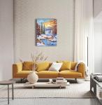 Работа выполнена акрилом на плотном картоне, вставлена в легкую рамку с защитным акриловым стеклом. Размеры картины 40х30см.