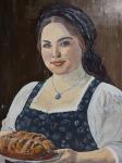 Каравай в её руках — не просто выпечка, а воплощение мудрости поколений, традиций, передающихся из века в век. Он словно говорит: «Дом жив, пока здесь пекут хлеб». А сама героиня картины — олицетворение той самой души дома, о которой сложены пословицы. «Красна изба не углами, а пирогами» — и в этом кроется великая истина. Ведь красота жилища измеряется не роскошью убранства, а теплом сердец, звучащим в каждом пироге, в каждой заботливо приготовленной трапезе.