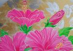 Картина. Медникова Ирина. Крупные розовые цветы гибискуса на золотом и серебряном абстрактном фоне, круглый холст