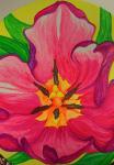 Картина акрилом на круглом холсте (тондо), выполненная флуоресцентными красками. В центре композиции — крупный, выразительный тюльпан с насыщенными розово-фиолетовыми лепестками, плавно переходящими друг в друга, что создаёт ощущение объёма и глубины. Сердцевина цветка выделена ярким жёлто-оранжевым оттенком. Жизнерадостный жёлтый фон дополнен сочными зелёными листьями, подчёркивающими свежесть композиции.