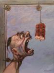 Экспрессивная картина в жанре гротеска, написанная маслом. В центре композиции — искажённое лицо человека с широко раскрытым ртом, полным острых зубов, устремлённое к подвешенному куску сала. Эмоции героя переданы с гиперболой: смесь отчаяния, жажды и бессилия.
