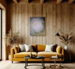 В центре композиции — световое ядро, собранное в круговом движении импульсивных мазков. Многослойная фактура создаёт ощущение глубины и внутреннего вращения, словно точка концентрации энергии и тишины одновременно.