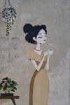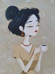 На картине изображена женщина, погружённая в спокойный момент уединения. Её мягкий жест с чашкой и закрытые глаза передают состояние внутренней тишины, когда можно отпустить суету и просто быть в моменте.