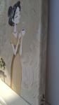 Тёплая, приглушённая цветовая палитра — бежевые, кремовые и природные зелёные оттенки — создаёт атмосферу уюта и гармонии. Рельефные мазки акрилом формируют живую фактуру фона, добавляя глубину и тактильность, словно пространство дышит вместе с героиней. Лёгкие растительные мотивы усиливают ощущение природного спокойствия и мягкой защищённости.