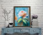 Иногда художнику достаточно двух цветов, чтобы сказать всё. Глубокий голубой фон и взрывные рыжие всполохи — в центре этого цветового противостояния белая роза с персиковой сердцевиной. Лепестки написаны пастозно, сочно, почти скульптурно — каждый мазок мастихина оставляет свой след. Это не просто натюрморт, а гимн контрасту, вдохновленный фовизмом. Работа заряжает энергией утра и смелостью цветовых решений. Повесьте её на кухне или в гостиной, и пространство наполнится витальной силой и радостью бытия.