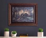 Представьте: глубокий лес, сумерки сгущаются, и только из окна охотничьей избушки льется тёплый свет. В этом золотом луче — рыжая лиса, словно вышедшая из сказки. Художник строит композицию на контрасте холодных синих теней и горящих оранжевых акцентов, создавая атмосферу тайны и уюта одновременно. Работа оформлена в стильный багет, который подчеркивает глубину перспективы. Это не просто пейзаж, а приглашение в тихий, волшебный мир на грани дня и ночи. Такая картина преобразит кабинет или библиотеку, наполнив пространство настроением созерцания и покоя.