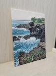 На холсте изображен апрельский день на Утесе Чусанджолли. Одна из достопримечательностей острова Чеджу в Южной Корее. Каменные столбы – лава с горы Халласан, застывшая когда-то при столкновении с морской водой.