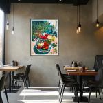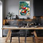 Работа наполнена энергией повседневной красоты: здесь простые предметы превращаются в живую, почти осязаемую сцену. Сочетание бирюзовых, красных, зелёных и кремовых оттенков придаёт картине декоративность и одновременно ощущение спонтанности, как будто момент был пойман на вдохе. Эта картина легко станет ярким акцентом в современном интерьере, привнося в пространство тепло, радость и ощущение жизни.