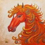 На картине изображен символ года, красный конь с золотистой гривой.