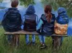 На этой картине передана атмосфера безмятежности и доверия. Вода здесь - не просто фон, а живое пространство, где стирается граница между реальным и отражённым миром. Тёплый свет, мягкие переходы цвета, нежная игра бликов на поверхности воды создают ощущение умиротворения и лёгкой мечтательности. Детские фигуры написаны с теплотой и психологической тонкостью. Кажется, что они не просто сидят у пруда - они живут этим моментом, делятся тайнами, слушают тишину, чувствуя единение с природой.