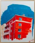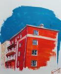 Дом, который изображен на картине, посторойки 30гг. - представитель конструктивистов и рационалистов. Недавно его отреставрировали и вернули оригинальную цветовую гамму: красный кирпич. Красный очень архетипичен для России. Рябина, красный-красивый, Кремль, Храм Василия Блаженного, декор Исторического музея, русские сарафаны и вышивки, хохолома и палех. Красный цвет - цвет нарядный, декоративный, цвет-узор, цвет праздник.