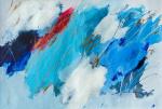 Композиция построена на активных синих, черных и розовых мазках, дополненных свободными графичными линиями. Контраст между плотными цветными участками и более легкими светлыми зонами создает ощущение движения и внутреннего напряжения.